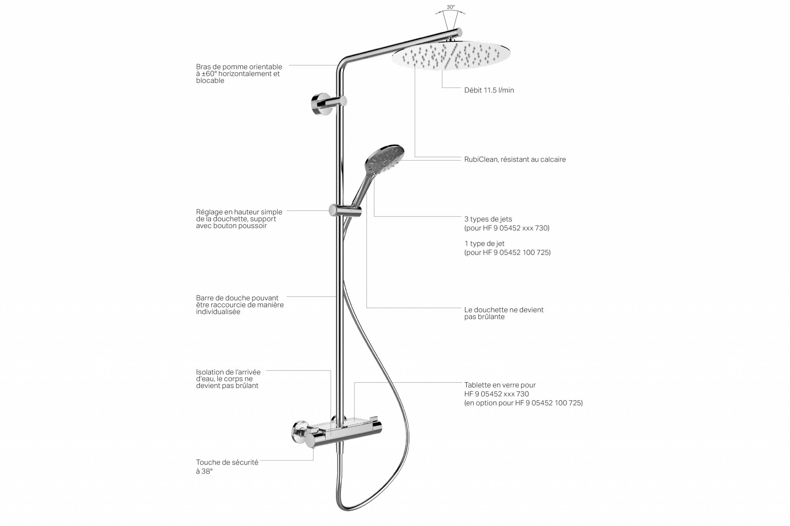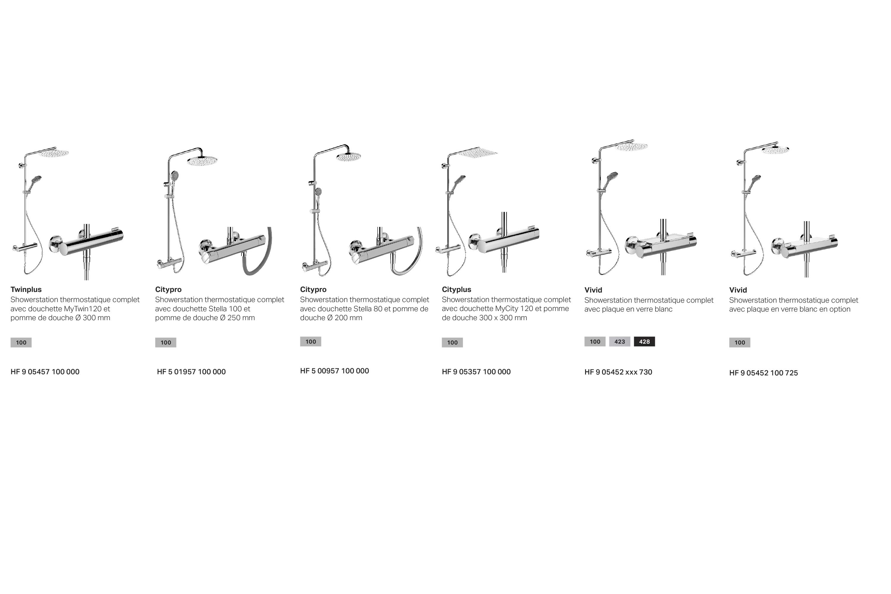 Les stations de douche thermostatiques constituent des solutions de bien-être compactes et faciles à monter. Les sets incluent un mitigeur thermostatique, une pomme à effet pluie, une glissière de douche métallique raccourcissable à bouton coulissant ainsi qu’une charmante douchette.