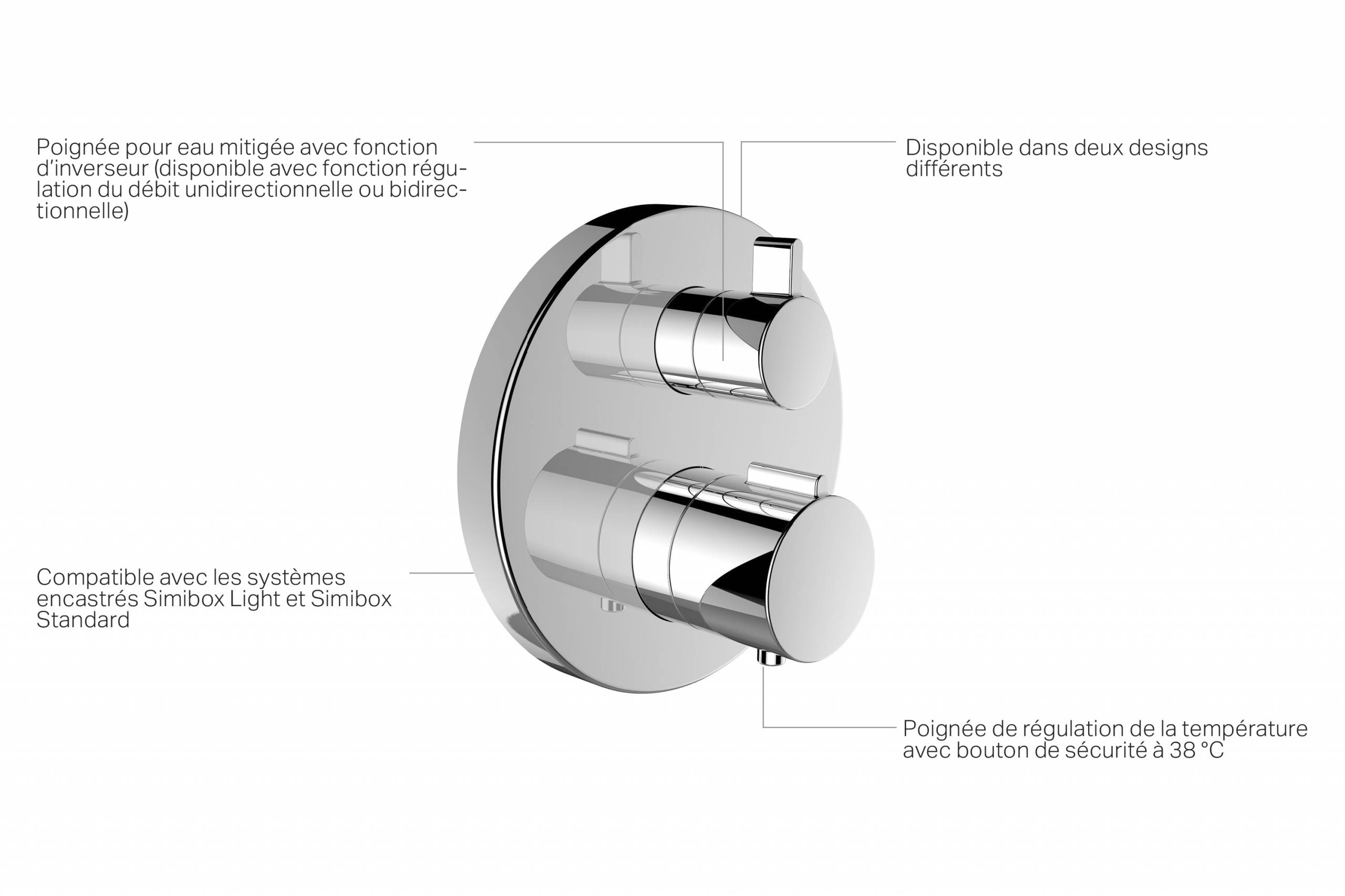 Une technologie de thermostat complète sous forme compacte: nos mitigeurs thermostatiques encastrés offrent le même confort que les thermostats apparents. La solution encastrée Simibox permet en outre de dissimuler la technologie dans le mur. Cela fait économiser de la place et permet d’aménager la salle de bains de manière élégante et esthétique.