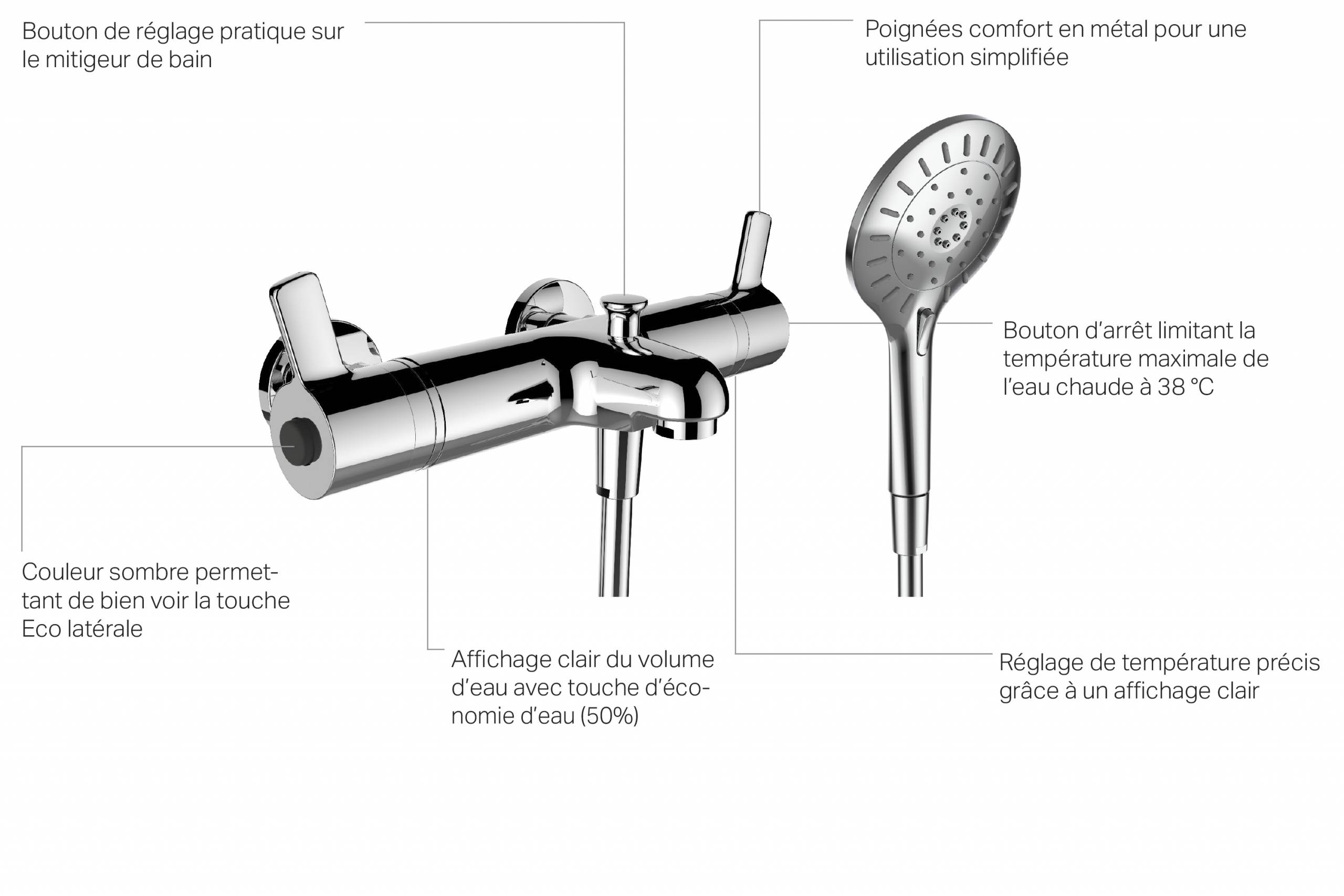 L’intérieur fonctionnel de nos thermostats apparents est remarquable, car ils disposent d’une fonction de protection intégrée. Celle-ci fait en sorte que l’arrivée d’eau chaude est automatiquement interrompue en cas de coupure d’eau froide. De plus, le corps de la robinetterie ne chauffe jamais grâce à la conduite d’eau chaude isolée, ce qui protège des brûlures. Le bouton d’arrêt adapté aux enfants offre en outre une sécurité supplémentaire sur nos thermostats Citypro et Thermofit. Celui-ci limite la température à 38° C. Pour faire couler de l’eau plus chaude, il faut tourner un bouton tout en appuyant dessus. On peut de surcroît faire facilement des économies d’eau au moyen de la touche Eco. Appuyer sur le bouton d’arrêt permet de quitter la zone Eco; le plein débit d’eau s’écoule alors.