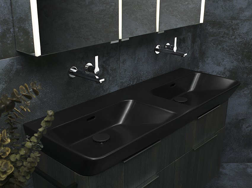 Swisstap bringt eine durchgängig stimmige Atmosphäre in das Badezimmer. Für den Waschplatz stehen zwei Waschtischmischer mit verschieden langen Ausladungen sowie ein hoher Standsäulenmischer zur Verfügung. Alle Modelle sind mit der Funktion Eco+ ausgestattet, bei der sich die mittige Grundstellung des Bedienhebels im Kaltwasserbereich befindet. Warmes Wasser fliesst erst beim bewussten Schwenken nach links, was sich positiv auf den Energiekonsum auswirkt.
