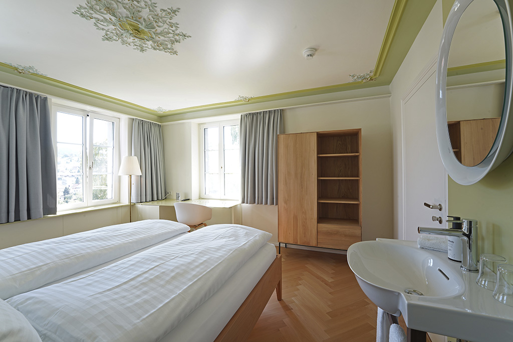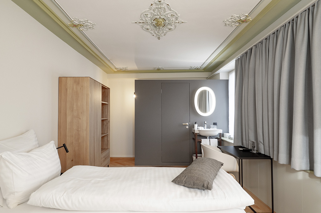 Die Gebäudehülle wurde komplett erneuert und der Eingangsbereich durch einen zweigeschossigen Portikus akzentuiert. Im Inneren wurden alle Einbauten entfernt und die historische Substanz wieder sichtbar gemacht. Der Saal und das Restaurant wurden aufgefrischt und behutsam renoviert. Mit grossem Respekt vor der klassizistischen Bausubstanz wurden die 20 Gästezimmer behutsam fit für die Zukunft gemacht. Entstanden sind Zimmer, die historischen Charme und modernen Komfort stilvoll vereinen.