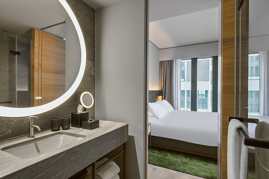 Auf 180’000 m2 Nutzfläche findet sich heute ein spannender Mix aus nationalen und internationalen Marken, Dienstleistungsunternehmen, Firmenniederlassungen sowie die Hotels Hyatt Regency und Hyatt Place mit eigenem Convention Centre. Mit der Ausstattung der über 550 Badezimmer in den beiden Hyatt-Hotels, der Sanitäranlagen im Convention Centre, im Gewerbebereich sowie im öffentlichen Bereich verantworten wir den grössten Teil der Badausstattung dieses Jahrhundertprojekts.
