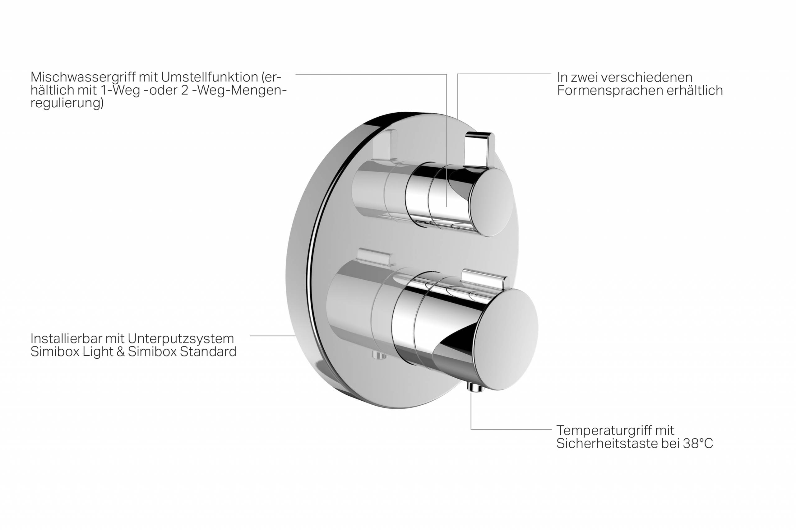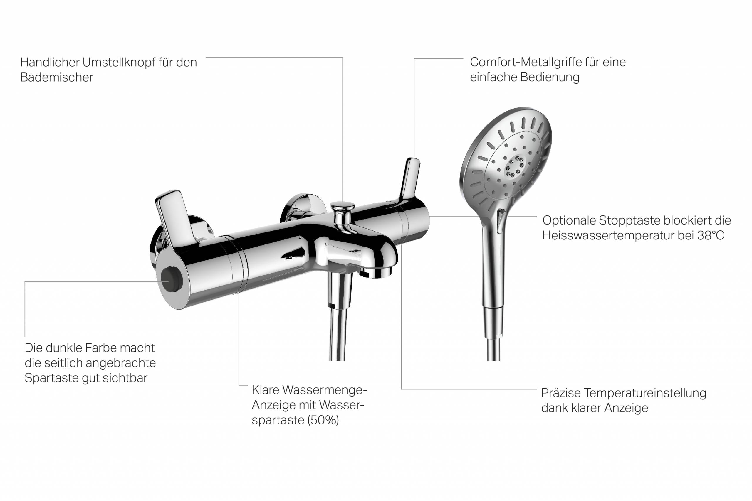 Mühsames Einstellen der Wassertemperatur beim Einsteigen in die Badewanne oder Dusche – wer kennt das nicht? Mit unseren gradgenau und einfach einstellbaren Thermostatmischern gehört dies der Vergangenheit an. Unsere Thermostate halten über die gesamte Füllzeit oder Duschdauer die eingestellte Temperatur und auch Temperaturschwankungen in den Wasserzuleitungen gleicht der Thermostat mühelos aus.