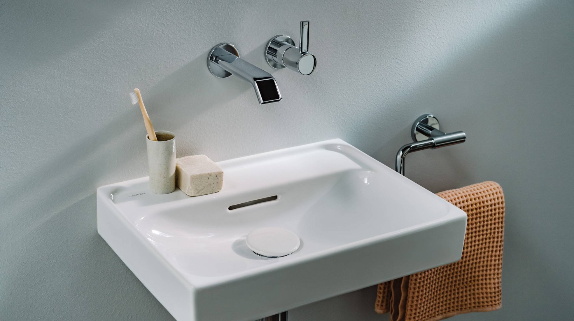 Ein besonderes Highlight der MEDA-Armaturen ist der breite Auslauf. Er integriert einen Strahlregler, der einen sanften, spritzfreien Wasserstrahl erzeugt und an einen kleinen Wasserfall erinnert.